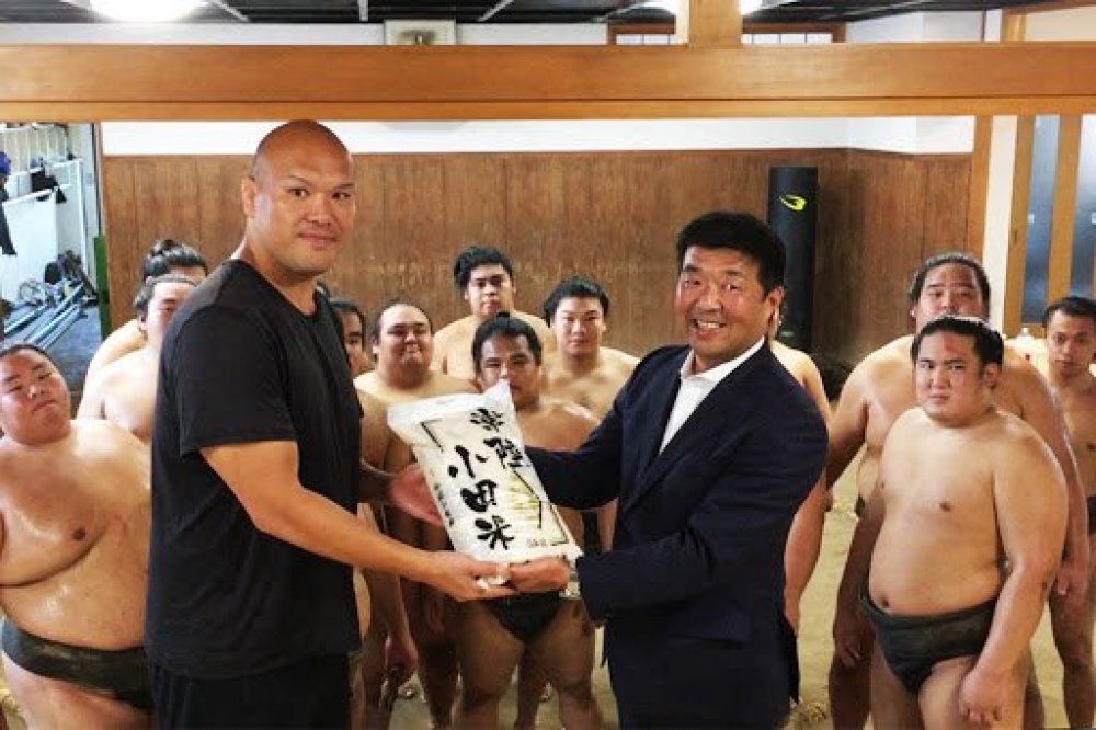 式秀部屋に差し入れ 地元のコシヒカリでエール