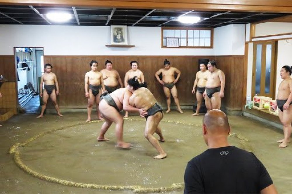 稽古に励む式秀部屋の力士たち