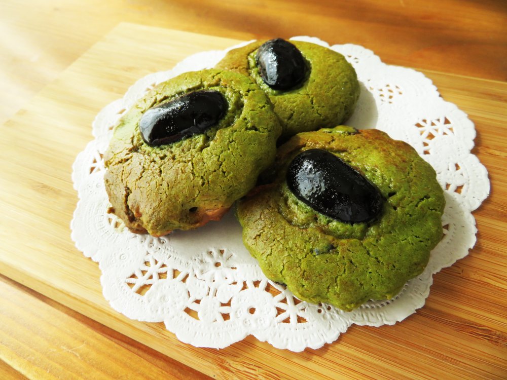 抹茶クッキー生地に、粗く刻んだ常陸大黒とホワイトチョコレートを混ぜ込みました。
