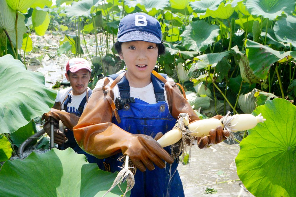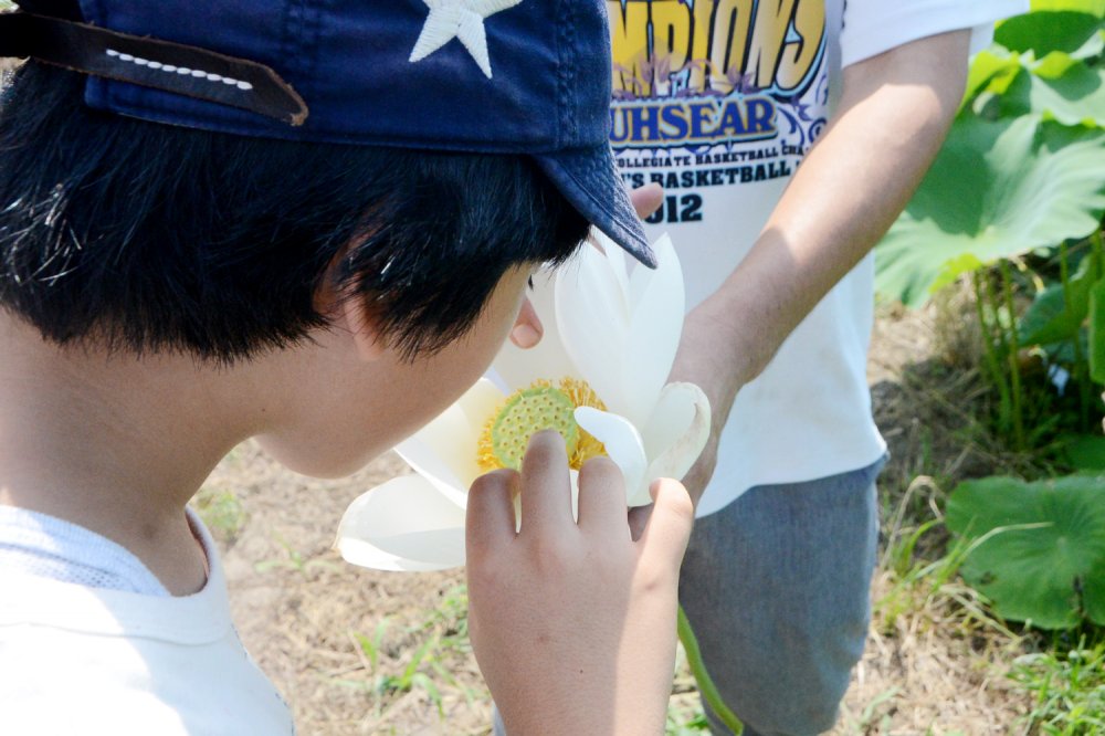 収穫したてのれんこんの先っぽを試食した湊くん。 その味は「タケノコの味に似ている」とのことでした。 れんこん畑で見つけた花の匂いは「蜂蜜の匂いがする」と湊くん。それを聞きつけた宮本さんは、「れんこんはちみつ」の可能性に思いを巡らせていました。