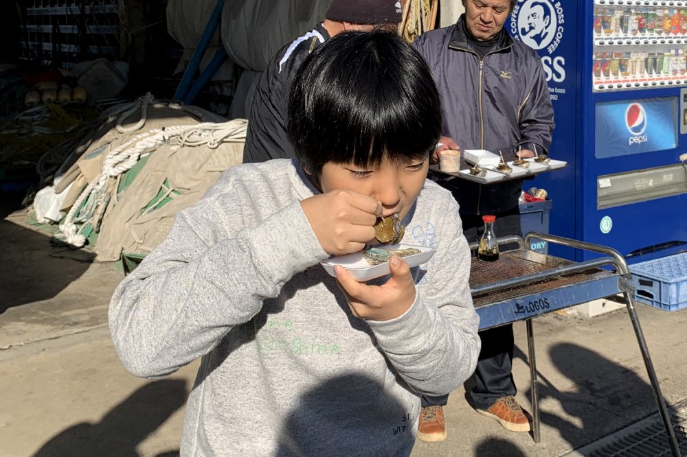 醤油の香ばしいにおいがする一口アワビを口にした湊くん。「柔らかい!」と頬張っていました。