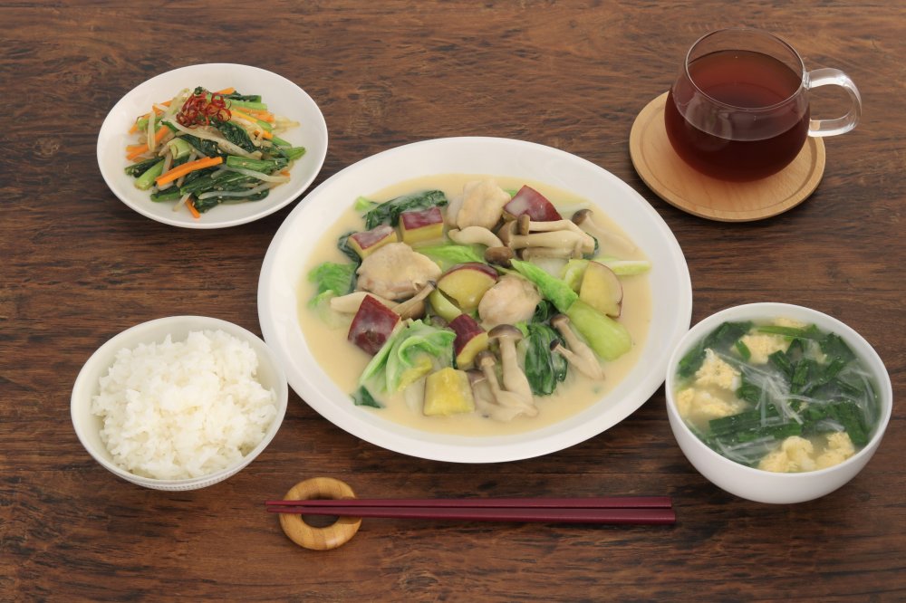 「さつまいもとチンゲン菜のクリーム煮献立」1日分の目標野菜摂取量の約2/3(244g)が摂れ、調理時間も30分以内♪