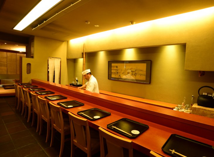 江戸の文化と伝統が今も息づく街、日本橋。「日本橋ゆかり」は、昭和10年創業の、日本橋の中心部にある老舗割烹店です。現在腕をふるうのは、3代目・野永喜三夫さん。村田吉弘氏の営む京都の名店「露庵 菊乃井」で修業を積み、現在は「日本橋ゆかり」の暖簾を守っています。 店内1階には、目の前で職人の技や会話が楽しめるカウンターやテーブル席、小上がりがあり、地下には個室、広間もあります。 店のコンセプトは、『温故知新』。店の設計やロゴデザインにも携わり、ビアージョッキも自ら作るなど、野永さんの“料理”は、調理だけに留まりません。 「料理人なんて、調理するのはあたり前。割烹のカウンターはショータイムです。魅せる場であり、伝える場です。日本料理の伝統を守りながらも、多方面で新しいことを発信したい。」と野永さん。 野菜を水で“炒める”調理法の開発など、驚くような発想と応用を得意とする野永さん。自ら監修した、「ヨネビシ醤油の干し椎茸の万能ソ-ス」は「調味料選手権2015」で優秀賞を受賞するなど、その発想は、料理法だけでなく商品開発などにも広がり、その独自の発想から生まれる新しいアイディアは、国内外からも注目されています。 ※右写真4枚目…「トマトのすり流し(2,650円)」野永さんの発想が光る、日本橋ゆかりを代表する一品。トマトを使ったすり流しの上に、かつおだしを重ねた二層仕立てのジュレ。上には汲み上げ湯葉のソースと海水漬けの紫ウニが載る。最初は二層それぞれを味わい、その後すべてを混ぜると“和風のガスパチョ”へと味が変化する。