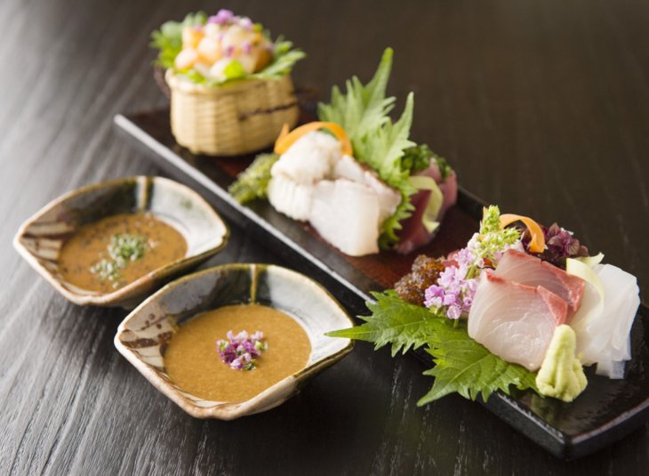 「茨城の食材はよく使っています。笠間市の小田喜さんの栗は毎年おせちで使っていますし、メロンの時期には、鉾田市の長洲さんのメロン、イチゴの時期には鉾田市の村田農園さんのイチゴも使っています。醤油も、常陸太田市のヨネビシ醤油さんを使っています。僕は、熱意とこだわりのある生産者の食材を使いたいので、作り手の想いを直に感じるために、現地に行くことも多いです。」と野永さん。作り手の想いを感じ、食の旬を見極めて、食材の“はしり”、“旬”、“なごり”を活かした料理を提供しています。 また、野永さんは、日立市の“菊水食品”の納豆を使った「万能納豆タレ」を監修し、世界に発信しています。 「菊水さんから、納豆を店で使ってくれないかと相談があったんです。納豆自体を店で使うのではなく、僕には納豆を使った新商品のアイディアがあったので、“納豆タレ”を開発しました。納豆は、人によってはにおいと粘りがネックです。それをうまいこと中和してやれば、おいしいタレができるんです。菊水さんは、管理が行き届いた環境で納豆を作るから、納豆自体のにおいが繊細。この納豆だからこそ、うまいタレができますね。」日本橋ゆかりのコースのお刺身には、必ず、醤油と納豆タレの2種類がつきます。「納豆タレには、大豆本来のうまみがあるから、魚や肉とすごく相性が良い。特に外国の方には好評です。」 「日本人は、海外のレセプションやイベントで、納豆をそのまま出そうとしたりする、これじゃ誰も食べません。パスタやバケットなど、その地域に根差している食材をベースに、そこに納豆タレを添える。そういう応用が必要なんです。」 このタレは、日本のみならず、海外でも試食を行い、評判を呼んでいます。