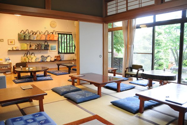 自宅を改築したという店内は明るく家庭的な雰囲気。大きな窓から見える日本庭園が美しいです。入ってすぐ左側にはデザインアートバッグが展示してあります。よく見ると店内の端々に陶器類もちらほら。どうやら店内はアートギャラリーでもあるようで、人脈の広いご主人の人柄がうかがえます。