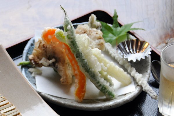 麓の代名詞とも言える看板メニュー『ぶっかけ納豆そば』は、つるつるシコシコのそばの上に山形県産の紅大豆からできた納豆「茶々丸」、大根おろし、カイワレと、近所の豆腐屋から仕入れた油あげが乗った、つゆをぶっかけて混ぜていただくタイプのそばです。「茶々丸」は大粒で見た目にインパクトはありますが、食べてみると決して主張しすぎず、そばの風味をより引き立たせる役割となっています。これに大根おろしの辛味と、外はパリッ、中はしっとりとした油揚げのコンビネーションが更に食欲をそそります。 また、そばだけでは足りない…という方には、野菜天せいろがオススメ。その名の通り、野菜のみの天ぷらですが、旬の地元産野菜が常時6種類も入っています。