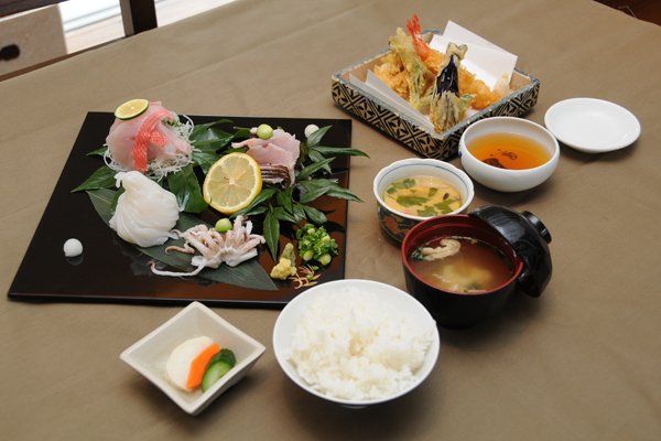 えんやどっと丸の一番人気のメニューは、お好みの魚を選べる「お好みお刺身定食」です。「お好みお刺身定食」は、その時期の旬の魚介類10種類ほどの中から、お客様がお好みの魚・貝を選び、盛り合わせにしてくれます。苦手な魚や貝があるお客様にも安心なメニューです。この定食は、お刺身の他にも海老と野菜の天ぷら・茶碗蒸しも付いてくるので、おなかいっぱい味わいたい方にもお勧めです。 お好みお刺身定食 刺身 お好みお刺身定食 全体図