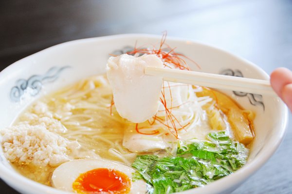 龍のひげでは、JAやさとの特産品である「つくばしゃも」を使ったラーメンを提供しています。 もともと、イタリアンの料理人として修業を積んでいた店主の来栖さんが、「将来はラーメンのお店を出したい。」との夢を叶えて開店したお店です。 店主一番のオススメ「しゃも塩らぁめん」は、濃厚なのにスッキリとした後味が特徴のスープと、自家製麺である細麺との相性が抜群。上に乗っている鶏肉のチャーシューは、ハーブ類の下味がつけられていて、とても柔らかくてジューシーです。 そして、つけ麺好きのかたにオススメしたいのは、「しゃも南蛮つけ麺」。つくばしゃもの鶏白湯と県産野菜をポタージュ状にしたものを合わせたスープが、ポリフェノール粉と全粒粉を合わせた太麺とよく絡み、どろっとしているのに後味がさっぱりしています。