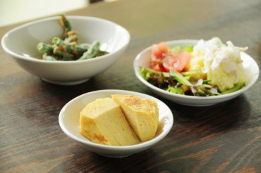 もともとそば打ちを趣味にしていた店主。おいしいそばをお客様に振る舞いたいという気持ちから、そば粉を探しましたが、なかなかおいしいそば粉を見つけられなかったそうです。 そんな時にそば打ち仲間に紹介してもらったのが「常陸秋そば」でした。 友蕎庵に入る道の入口には、小規模ながら立派な常陸秋そばの畑があります。これは店主自身で栽培しているもの。友蕎庵で提供されるそばは、半分は石臼挽き、もう半分はロールで挽いているそうで、つるつると喉に入っていき、細切りながらもコシのある食感を楽しむことができます。 一番の人気メニューは「おまかせセット」です。冷たいそばに季節の野菜を使った天ぷらと厚焼き卵、漬物等の小鉢、食後にコーヒーとデザートが付いた大変ボリュームのあるメニューです。 (おまかせセットは4名様から受け付けています。)