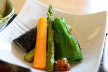 野菜たっぷりヘルシーメニューとして登場したのがヘルシーそば御膳(※要予約)です。小鉢が数品付くこのメニューは特に地産地消を心掛けています。 天ぷらよりもカロリーをおさえられる素揚げにした野菜やサラダには自家栽培の野菜を中心に、地元の野菜をふんだんに使用。また、ゆばは奥久慈ゆば、温泉卵も奥久慈卵、デザートの杏仁豆腐にも、大子のりんごを使って作ったりんごのジャム(季節によって変わります)がのっているなど徹底した地産地消っぷりです。