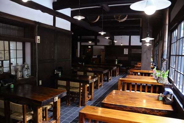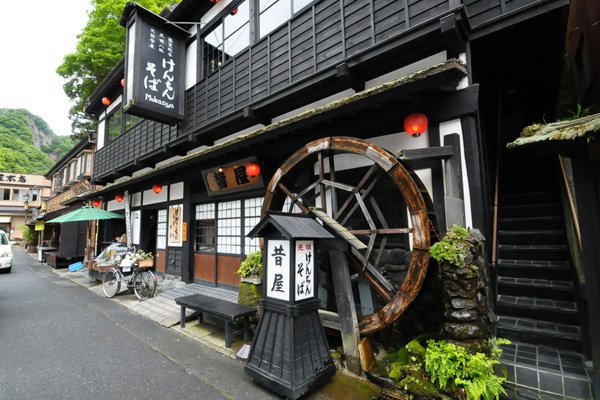 高さ120メートル・幅73メートルの大きさを誇り、日本三名瀑のひとつに数えられる「袋田の滝」。茨城県内でも人気の観光スポットです。その「袋田の滝」の入口付近に茨城県の郷土料理けんちんそばを初めてメニューとしてお客様に提供したおそばやさんがあると聞き、大子に足を運びました。 「袋田の滝」を目指していくと、入口付近にはたくさんのお土産物を販売しているお店や飲食店が目にはいります。そして、その中に築後200年の古民家を移築した建物を発見!入口にはけんちんそば発祥処 昔屋とあります。時折回る水車を横目に店内に入ると、黒々とした太い梁が天井を貫き、タイムスリップしたかのような空間が広がり、期待感が膨らみます。