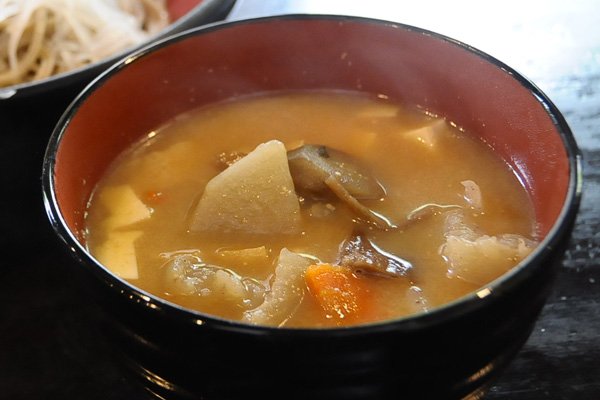 けんちんそば発祥処 昔屋の看板メニューは、もちろん、けんちんそば。温かいけんちんに、おそばが入っているけんちんそばと、細長くカットされた大根がトッピングされている冷たいおそばをけんちんにつけて食べる昔屋そばがあります。多くのお店では、冬季しか食べられないけんちんですが、なんと、昔屋ではどちらのメニューも通年で食べられるそうです。 けんちんには、手作りこんにゃくと大根、人参、ごぼうなどの野菜がたっぷり入っています。まろやかな味噌仕立てで、昔なつかしさを感じます。