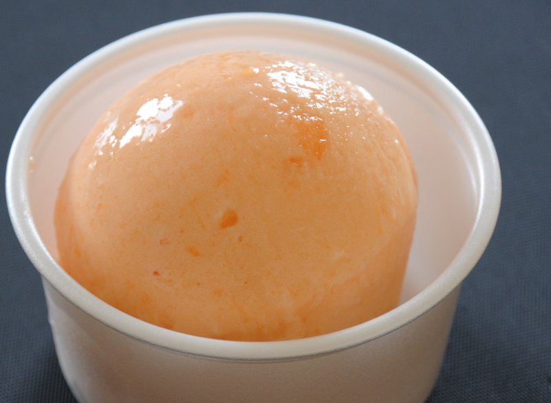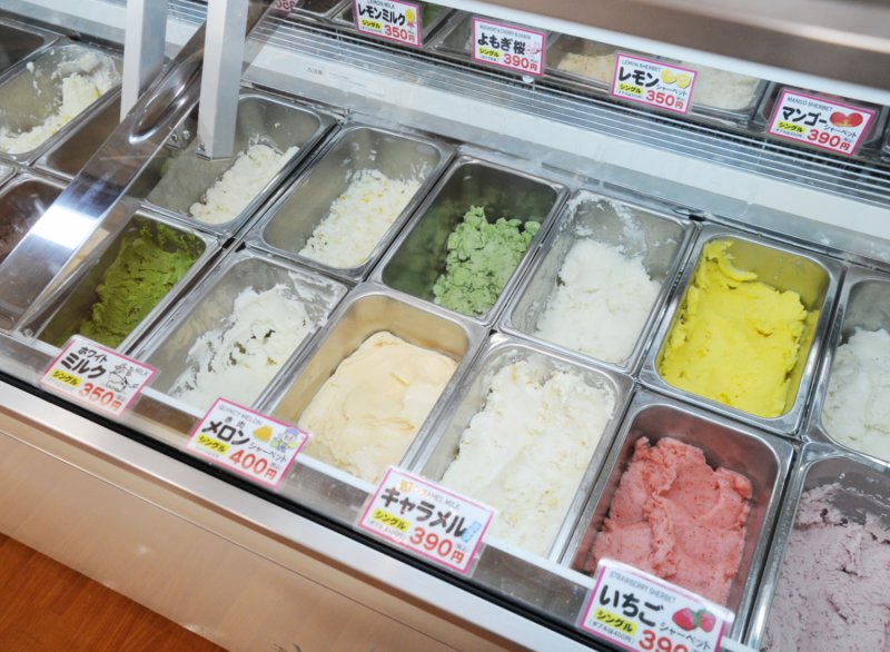 ジェラートコーナーは、直売所「わだい万菜」とレストラン「華こぶし」の間にある「茨城物産品販売所」の奥にあります。向かって一番左の「冷」という木製の看板が目印です。 コーナーには、約20種類ほどのジェラートとシャーベットがズラリ。 お目当てのメロンシャーベットは、「赤肉メロン(¥400)」(シングルカップのみ)として販売されています。