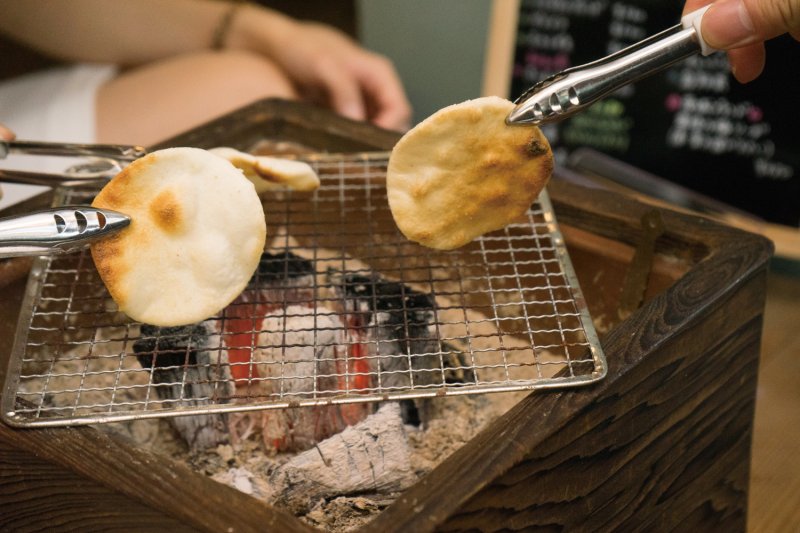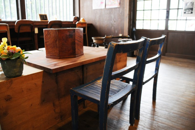 店内は、従来の「せんべい屋」のイメージを覆すようなおしゃれな雰囲気で、ご近所からいただいたという椅子や、店主の祖母が使っていたという「足ふみミシン」のテーブルなど、温かみのあるアンティーク家具が揃えられています。また、全卓に火鉢が置かれ、どこか童心に帰らせてくれるような佇まいです。