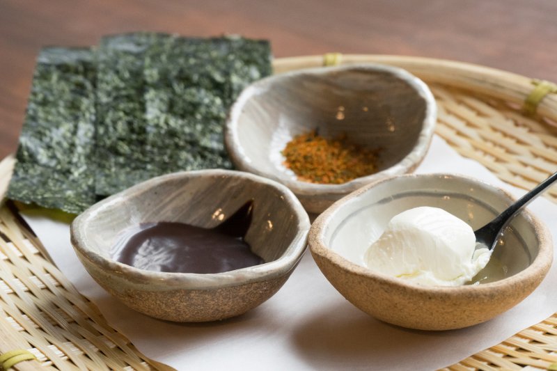 お煎餅は、「昔ながらのしょうゆ」、「しみせん」、「海苔」、「みよこの七味」、岩塩とオリーブオイルでいただく「ソルト・ペッパー」など5種類。その他にも夏は「アイスせんべい」など季節に合わせた限定煎餅も随時登場します。トッピングも4種類あり、なかでもはちみつとバターの「ハニーディップ」は、甘じょっぱさが後を引く逸品で、一度食べたらやみつきになります。
