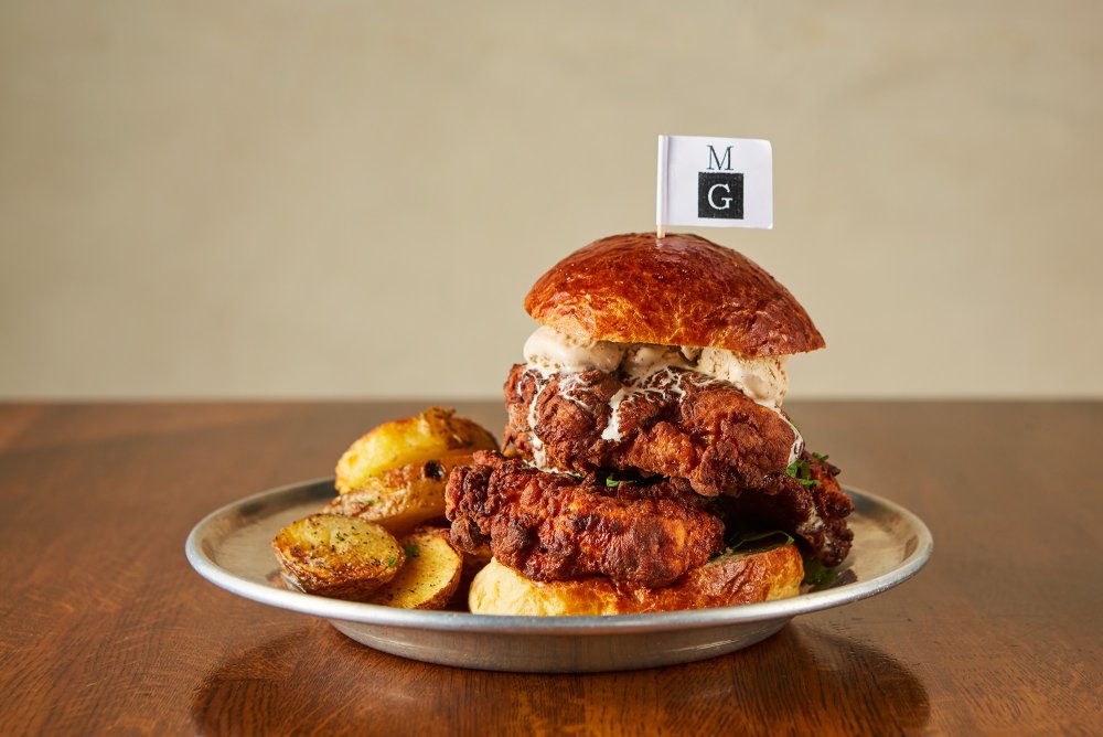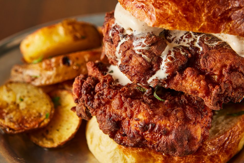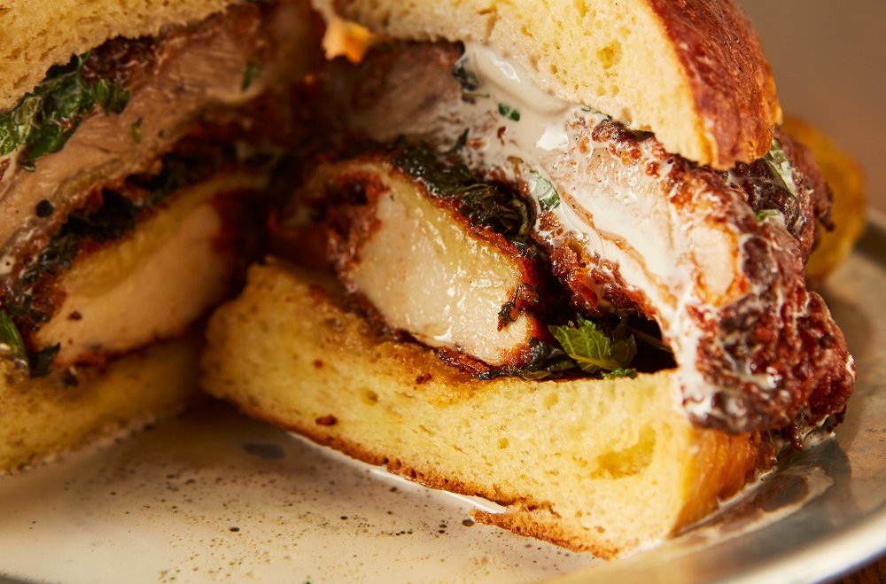 奥久慈しゃもの料理としては今までにない斬新で画期的なバーガーメニュー。しゃも肉は、クミン、オレガノなど20種類近いスパイスで味付けしジャンクな仕立てに。モモ肉とムネ肉の両方を使用し、肉汁を逃さずしっとり仕上げるために1枚肉をまるっと揚げている。茨城県のパン用小麦品種「ゆめかおり」を使ったブリオッシュ生地の自家製バンズはほんのりと甘く、旨味が凝縮された奥久慈しゃものフライドチキンと、仕上げに自家製ミントアイスクリームを挟み、贅沢に頬張ってみたい。