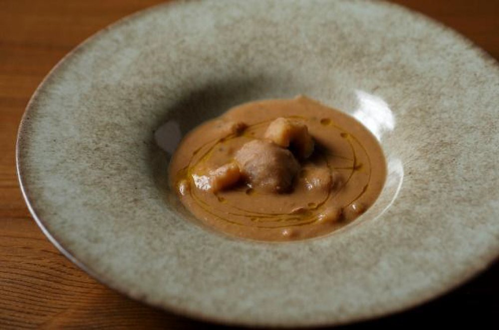 「七谷鴨赤味噌と椎茸のデュクセル 鬼皮と朴葉の燻製/岸根と鴨腿肉のパテ/飯沼栗とフォアグラ、トリュフ風味のクロメスキ」