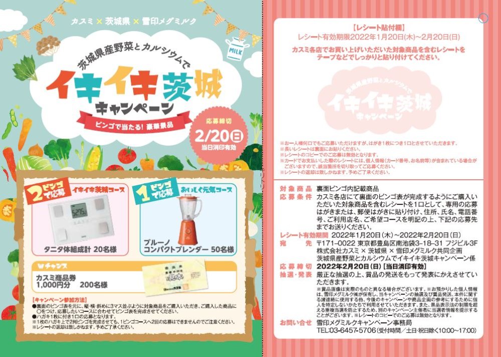 【応募締切2/20(日)】カスミ×茨城県×雪印メグミルク「茨城県産野菜とカルシウムでイキイキ茨城キャンペーン」実施中!(2022/01/20)