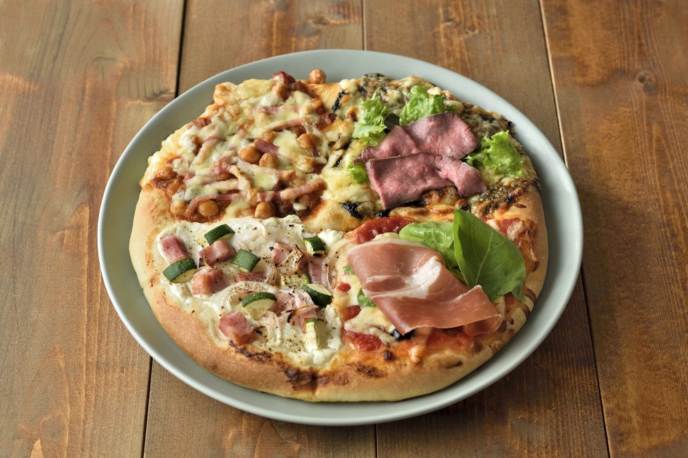 日本「海苔チーズ」、ドイツ「サワークリーム」、コスタリカ「チリコンカン」、スペイン「アンチョビトマト」といった4カ国を味わえるソースに、常陸牛ローストビーフや常陸の輝き生ハム等を盛り込んだ豪華なクアトロピザ!