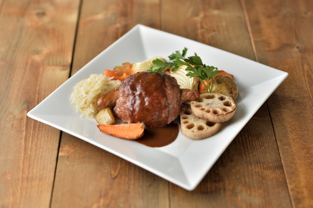 常陸の輝きソーセージに、たっぷりの常陸牛ひき肉を固め付けた原始人もびっくり?!すること間違いない夢のようなリッチなマンモス・ハンバーグ!