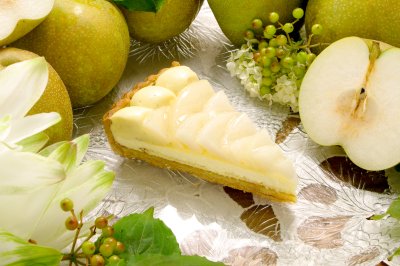 糖度が高く酸味が少ないジューシーな梨と、なめらかな舌ざわりのバニラババロア、じっくりと香ばしく焼き上げたアーモンドクリームを重ねた“今が旬”のタルトです。