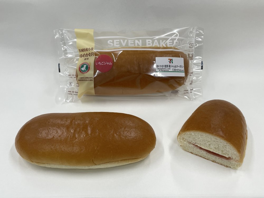 特 長:パン生地の小麦粉に90%茨城県産ゆめかおりを使用。ふんわりくちどけの良い生地と風味豊かないちごジャム、塩味の効いたマーガリンを組み合わせたパンです。