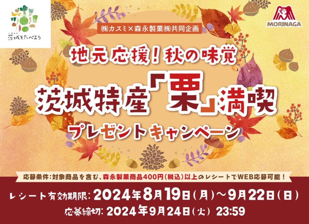 カスミ店舗で森永製菓対象商品をお買い上げのお客様に、抽選で氷蔵庫で熟成させたとっても甘い茨城県産「むき栗400g」または「生産農家こだわりの栗商品」が当たるプレゼントキャンペーンが実施中です。
