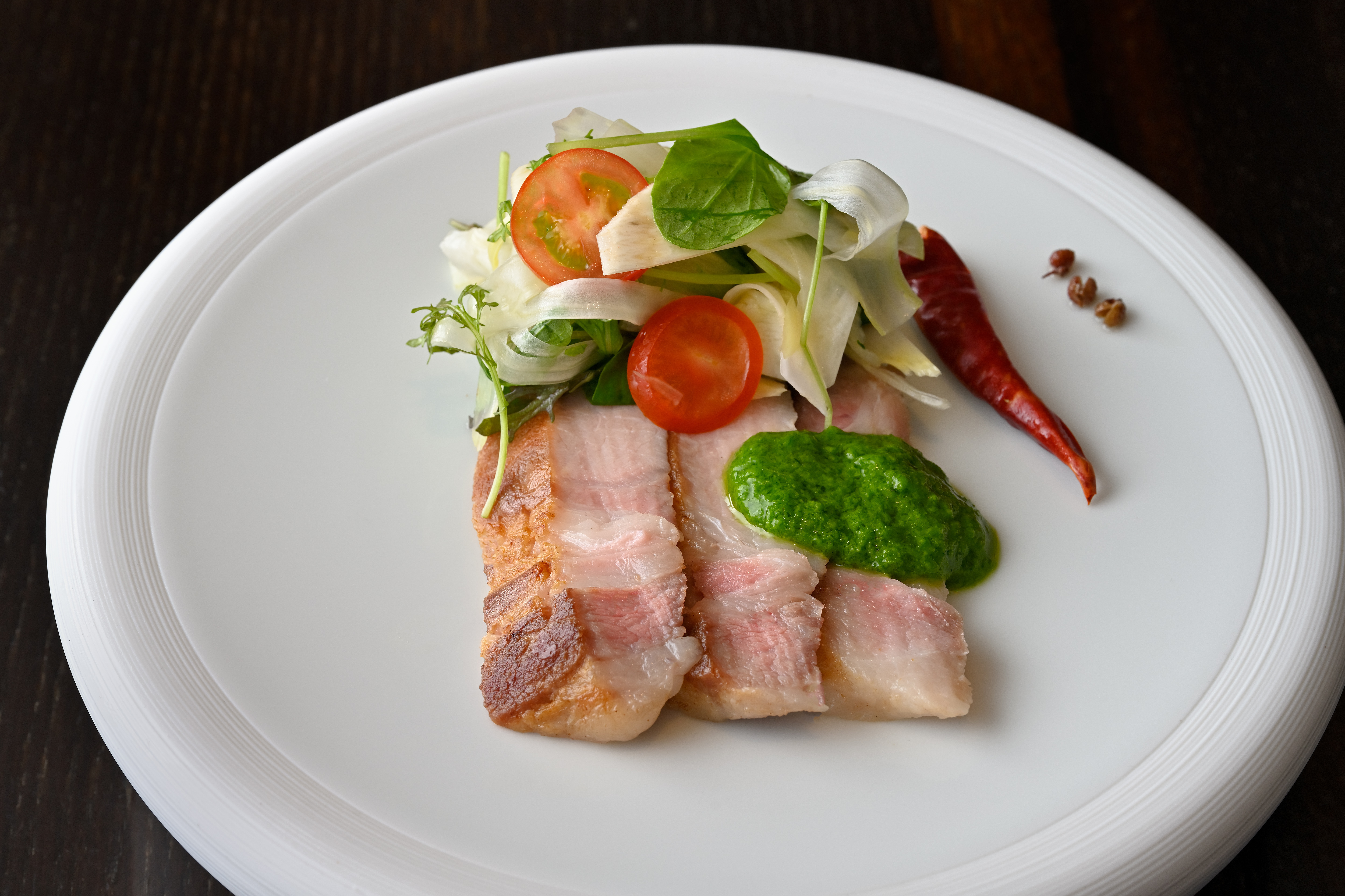 ◆常陸の輝きロース肉の低温調理椒麻ソース添え