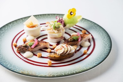 『常陸の輝き』バラ肉を焙じたオリーブの葉と共にジャンボン・キュイの