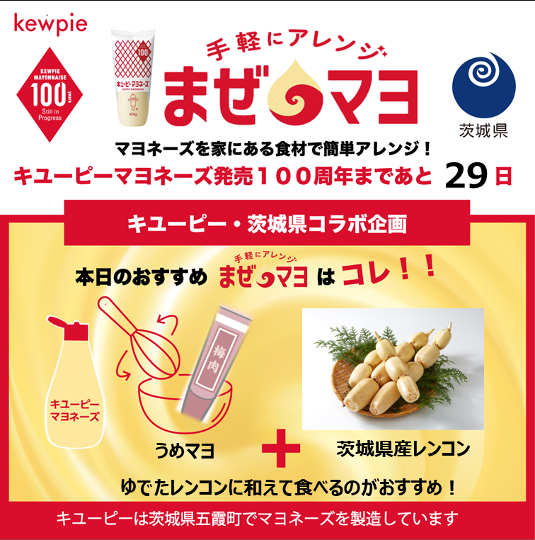 EVENT / 旬のうまいもの特集 新着・イベント情報 【1/31(金)~】キユーピーマヨネーズ発売100周年カウントダウン企画スタート!!(2025/01/31) 五霞町にある工場でも製造しているキユーピーマヨネーズは、2025年に100周年を迎えます。 3月1日「マヨネーズの日」までカウントダウンとともに、マヨネーズを家にある食材で簡単アレンジした「まぜマヨ」と茨城県産食材のおすすめの食べ方をSNS(X、facebook、Instagram)で、ご提案していきます。 ぜひ、この機会に茨城をたべようの公式SNSアカウントをフォローしてください♡【茨城をたべよう公式SNS一覧】XfacebookInstagram 今、おすすめの記事 {{row.type_jp}} {{row.title}}