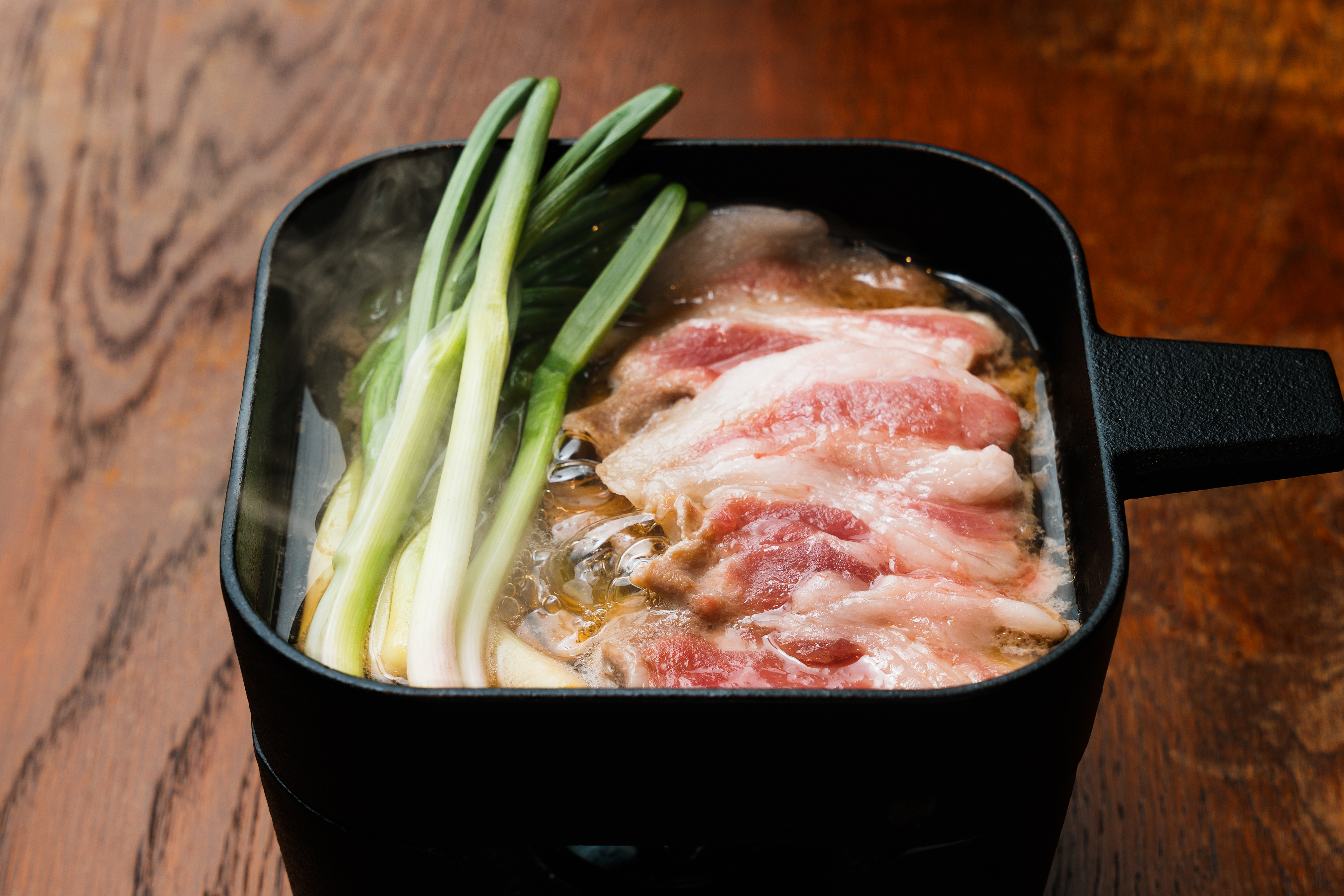 お肉の香りが強い肩ロースの旨みを生かして、シンプルに浅葱と召し上がっていただく1人前のすき焼きです。