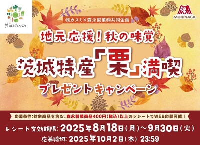 カスミ店舗で森永製菓対象商品をお買い上げのお客様に、抽選で、氷蔵庫で熟成させたとっても甘い茨城県産「むき栗400g」または「生産農家こだわりの栗商品」が当たるプレゼントキャンペーンが実施されます!