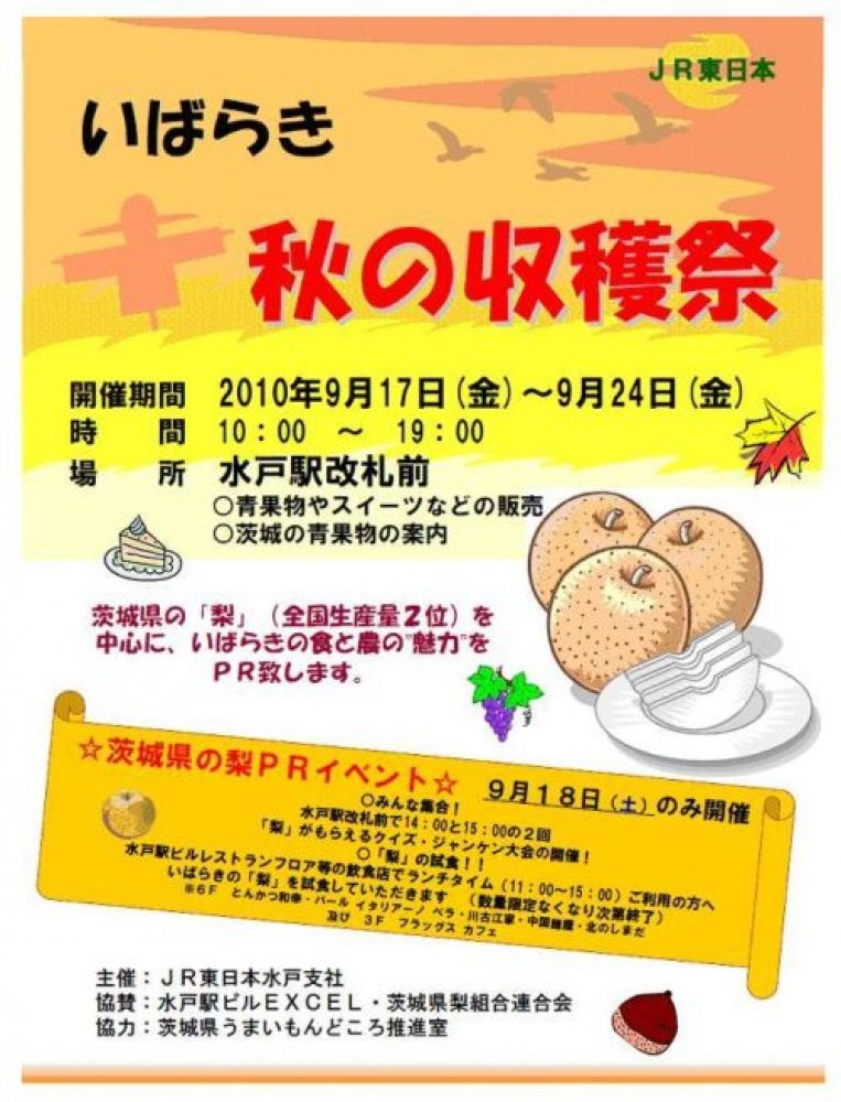 EVENT / 旬のうまいもの特集 新着・イベント情報 『いばらき・秋の収穫祭』 in 水戸駅(終了しました)(2010/09/17) 水戸駅改札前で、生産量全国第2位を誇る「いばらきの梨」の紹介や梨を使ったスイーツの販売が行われます。 また、9月18日(土曜日)には、「梨」がもらえるクイズ大会や、ハッスル黄門とのじゃんけん大会も実施されます。是非お越しください。 【日時】 9月17日(金曜日)~9月24日(金曜日) 10:00~19:00 【主催】 JR東日本水戸支社 【協賛】 水戸駅ビルEXCEL・茨城県梨組合連合会 【協力】 茨城県うまいもんどころ推進室 【お問い合せ先】 JR東日本水戸駅支社 営業部事業課 電話:029-224-1276 今、おすすめの記事 {{row.type_jp}} {{row.title}}
