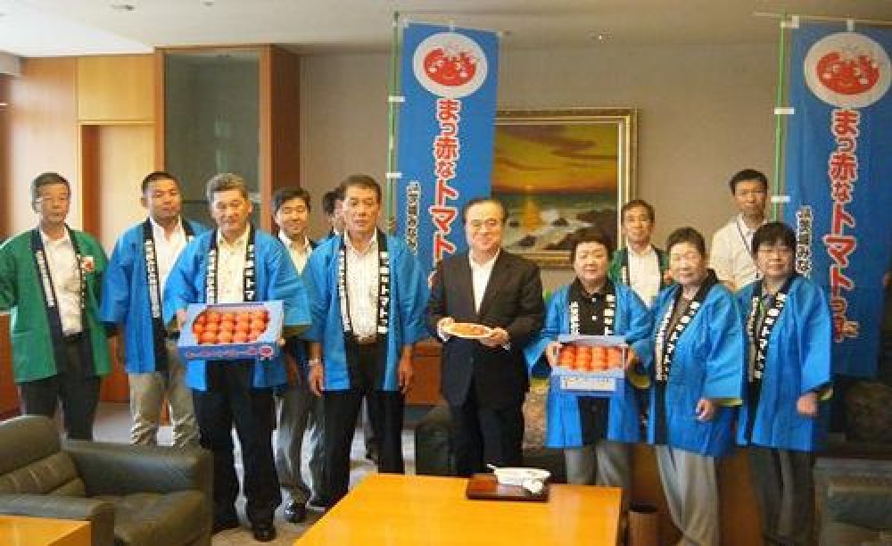 6月24日(金),JA茨城みなみの大木代表理事組合長,つくばみらい市潮田副市長,取手市油原まちづくり振興部長他関係者のみなさんが県庁を訪れ,橋本知事にJA茨城みなみの特産品である「トマト」のPRとトマトを使ったカレーの紹介がありました。