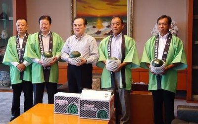 8月4日(木曜日)、桜川市の中田市長、JA北つくばこだま西瓜部会の藤田副部会長ほか計14名のみなさんが、橋本知事に旬を迎えた黒こだま西瓜をPRしました。