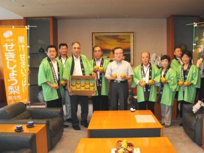 8月25日(木曜日),筑西市の吉澤市長,JA北つくばの生産者の代表など計16名の皆さんが県庁を訪れ,橋本知事に出荷最盛期を迎えている「梨」を贈呈し,産地のPRを行いました。
