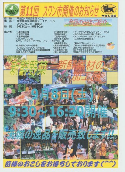 『スワン市』は、福島第一原子力発電所の事故後、風評被害に苦しむ茨城の農家を支援しようと、ヤマト運輸株式会社の茨城主管支店が企画。風評被害の払拭と茨城県の活性化を兼ねて、ヤマト運輸のグループ会社である『銀座スワン』を利用し、茨城県産品の販売イベントを開催します。