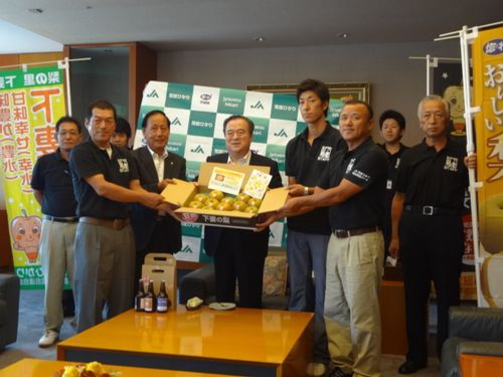 8月27日(月曜日)、下妻市の稲葉市長をはじめ、下妻市果樹組合連合会 下妻梨PRプロジェクトチームやJA常総ひかりの生産者の代表など計9名の皆さんが県庁を訪れ、橋本知事に出荷最盛期を迎えている「下妻甘熟梨」を贈呈し、産地のPRを行いました。