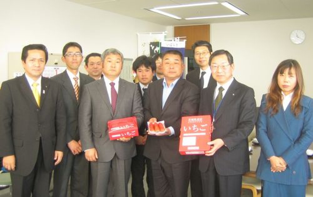 平成25年1月15日(火)、小美玉市のいちご生産者グループ「拓実(たくみ)の会」の浜野会長ほか関係者のみなさんが、これから旬を迎える「いちご」をPRしました。