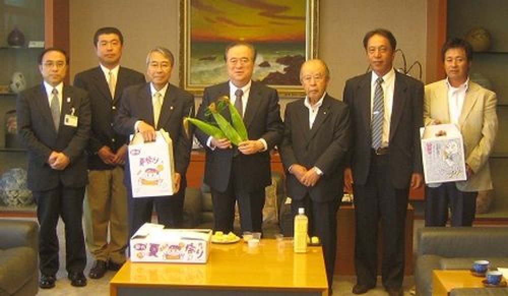 5月31日(金),結城市の前場市長,JA北つくばの藤田代表理事組合長と,JA北つくば結城市園芸部会トウモロコシ部の宮田部長他関係者のみなさんが県庁を訪れ,これから旬を迎えるトウモロコシ「夏祭り」をPRしました。