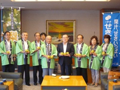 県庁を訪れ,橋本知事に今年も無事に出荷を迎えた幸水梨を贈呈し,産地のPRを行い