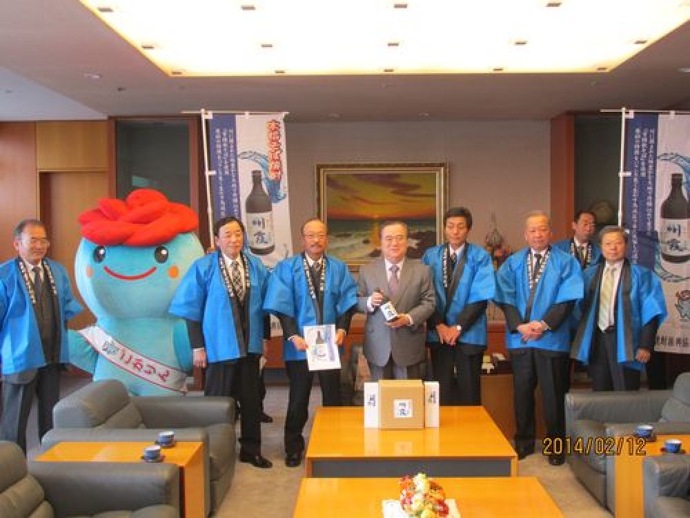 2月12日(水)、五霞町の染谷森雄町長、JA茨城むつみの青栁初男代表理事組合長、五霞町そば焼酎振興協議会の影山徳治会長、ほか計11名が県庁を訪れ、そば焼酎「川霞(かわかすみ)」のPRを行いました。