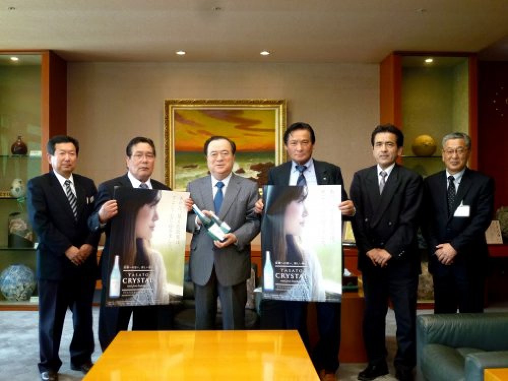石岡市・JAやさとの皆さんが,4月20日(水)に県庁を訪れ,4月23日(土)に発売となる純米大吟醸「やさとクリスタル」のPRを行いました。
