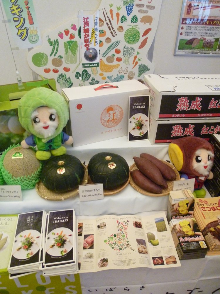 茨城県内の観光情報と合わせて,農林水産物ブースでは,茨城県オリジナル品種メロン「イバラキング」や地理的表示保護制度(GI)に登録されている「江戸崎かぼちゃ」,ブランド産地として名高い行方市の「かんしょ」をPRしました。