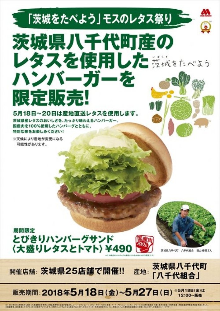 5月18日(金)~27日(日)の10日間、「茨城をたべようWeek」に合わせて、茨城県内のモスバーガー全25店舗で『「茨城をたべよう」モスのレタス祭り』を開催します。
