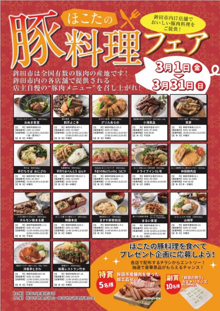 EVENT / 旬のうまいもの特集 新着・イベント情報 ほこたの豚料理フェアが開催されます!(2019/03/01) 3月1日(金)から3月31日(日)の間、鉾田市内の17店舗でおいしい豚肉料理が食べられる「ほこたの豚料理フェア」が開催されています。 茨城県鉾田市は、「日本でいちばん野菜をつくる街」ですが、実は全国有数の豚の産地でもあるのです。 フェア参加店で提供される、店主自慢の豚肉メニューをぜひご賞味ください。 対象メニューを食べると、プレゼント企画にもエントリーできますので、ぜひご応募ください。 今、おすすめの記事 {{row.type_jp}} {{row.title}}