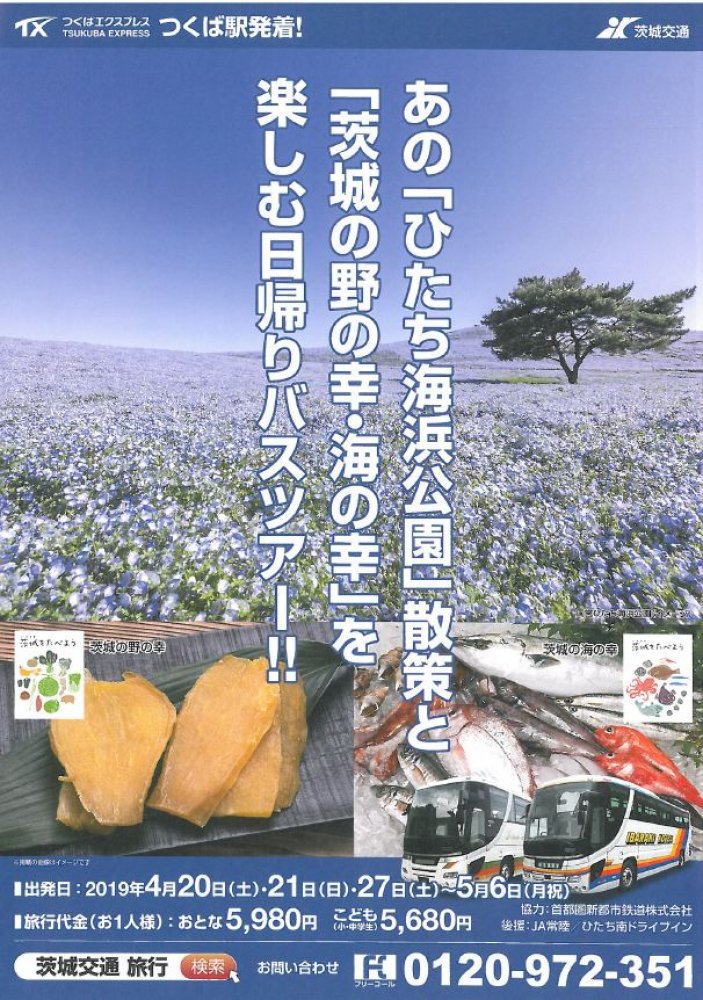 TXつくば駅発着!あの「ひたち海浜公園」と「茨城の野の幸・海の幸」を楽しむ日帰りバスツアー!!(2019/04/01)
