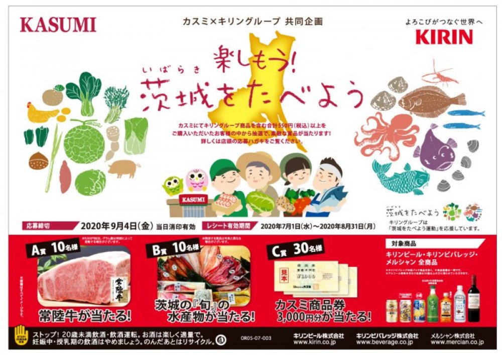 EVENT / 旬のうまいもの特集 新着・イベント情報 【応募締切9/4(金)】「楽しもう!茨城をたべよう」開催中!(2020/07/01) 「茨城をたべよう」応援企画!! 【応募締切9/4(金)】カスミ×キリングループ共同企画「楽しもう!茨城をたべよう」開催中! カスミにてキリングループ商品を含む合計550円(税込)以上を購入した方の中から抽選で,素敵な商品が当たります! 詳しくは店頭の応募ハガキをご覧ください。 ○応募締切 2020年9月4日(金)当日消印有効 ○レシート有効期間 2020年7月1日(水)~2020年8月31日(月) 今、おすすめの記事 {{row.type_jp}} {{row.title}}