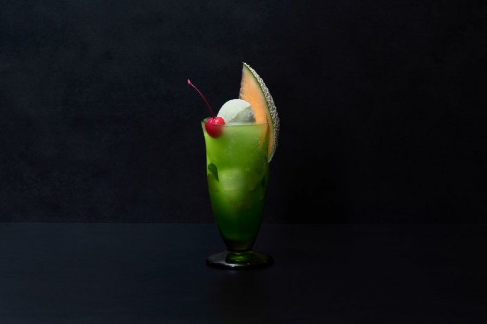 メロン専門工房<果房 メロンとロマン>が手掛ける「専門店のクリームソーダ」。トップにあしらうメロンに茨城県鉾田市産“プレミアムメロン”を使用しています。