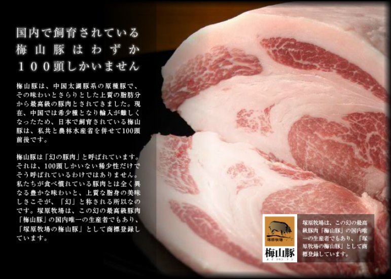 梅山豚とは、中国太湖豚系の原種豚で、日中友好のシンボルとしてパンダの次に贈られた由緒正しい豚です。現在日本に現存する梅山豚原種豚は約100頭、その希少性に加え、私たち日本人が食べ慣れている豚肉とは異なる豊かな味わいと、さらりとした上質の脂肪分から、最高級の豚肉とされています。